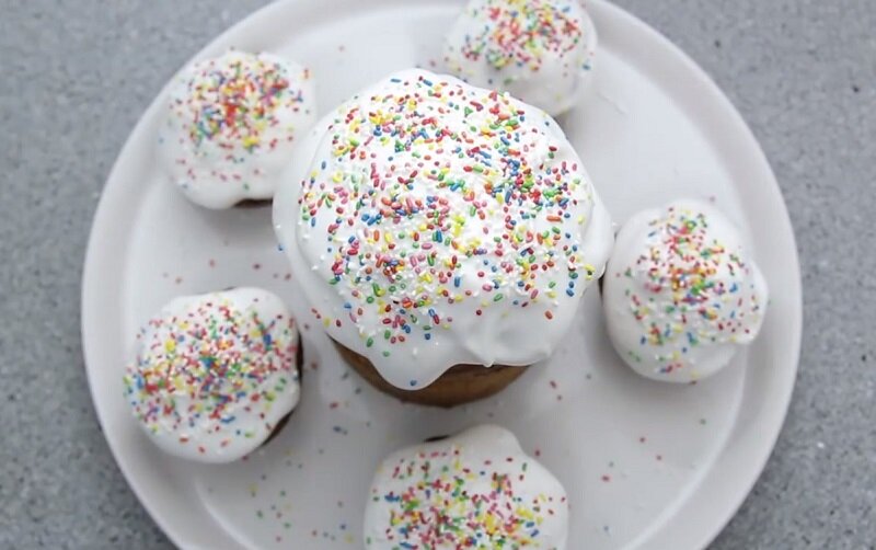 15. Горячие куличи покрывают глазурью, а сверху украшают разноцветными элементами. Необходимо помнить, что помадка застывает за короткое время!