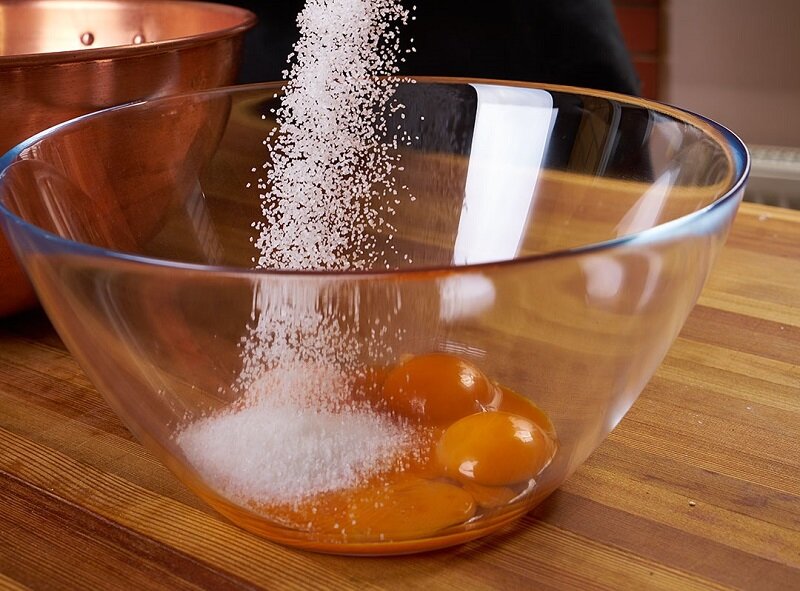 3. С использованием миксера яйца с сахаром взбивают, пока не получится пышная масса.