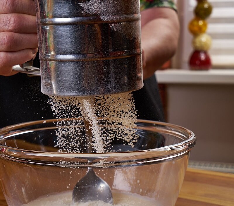 1. Молоко подогревают, чтобы сделать его только теплым, но не горячим, далее разводят в нем дрожжи, обычные, сухие брать не следует.